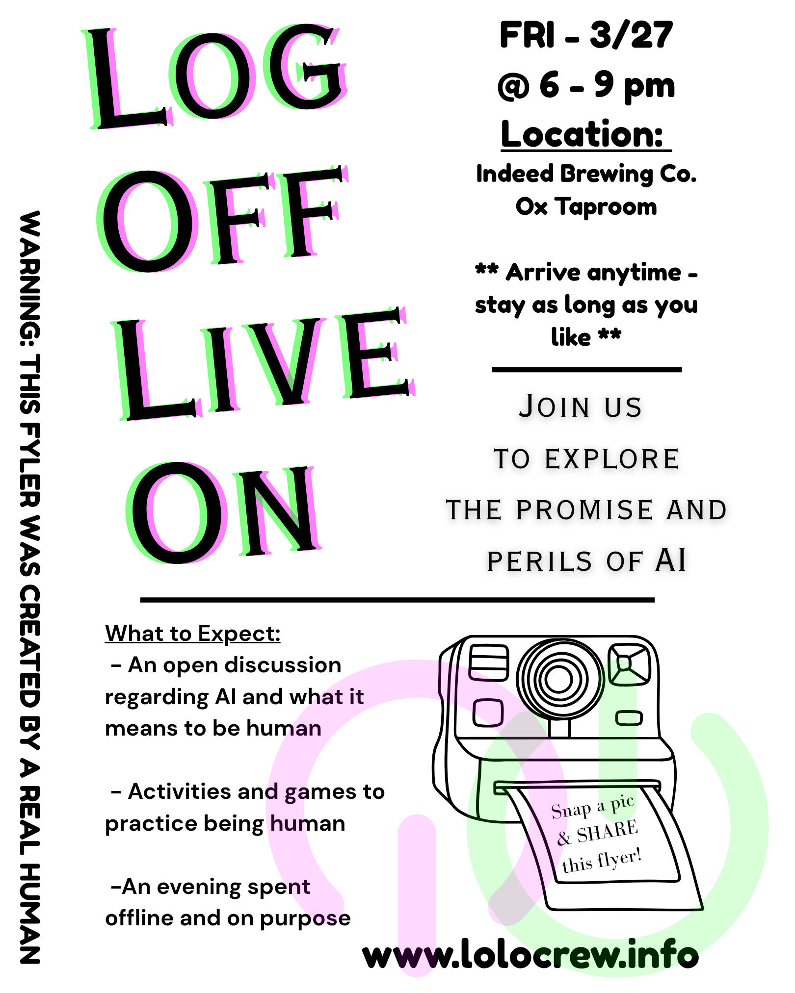LOLO Crew will consist of an in-person meetup on the last Friday of every month. (Currently in Minneapolis.)These meetups will include different activities every month exploring online habits and offline goals.